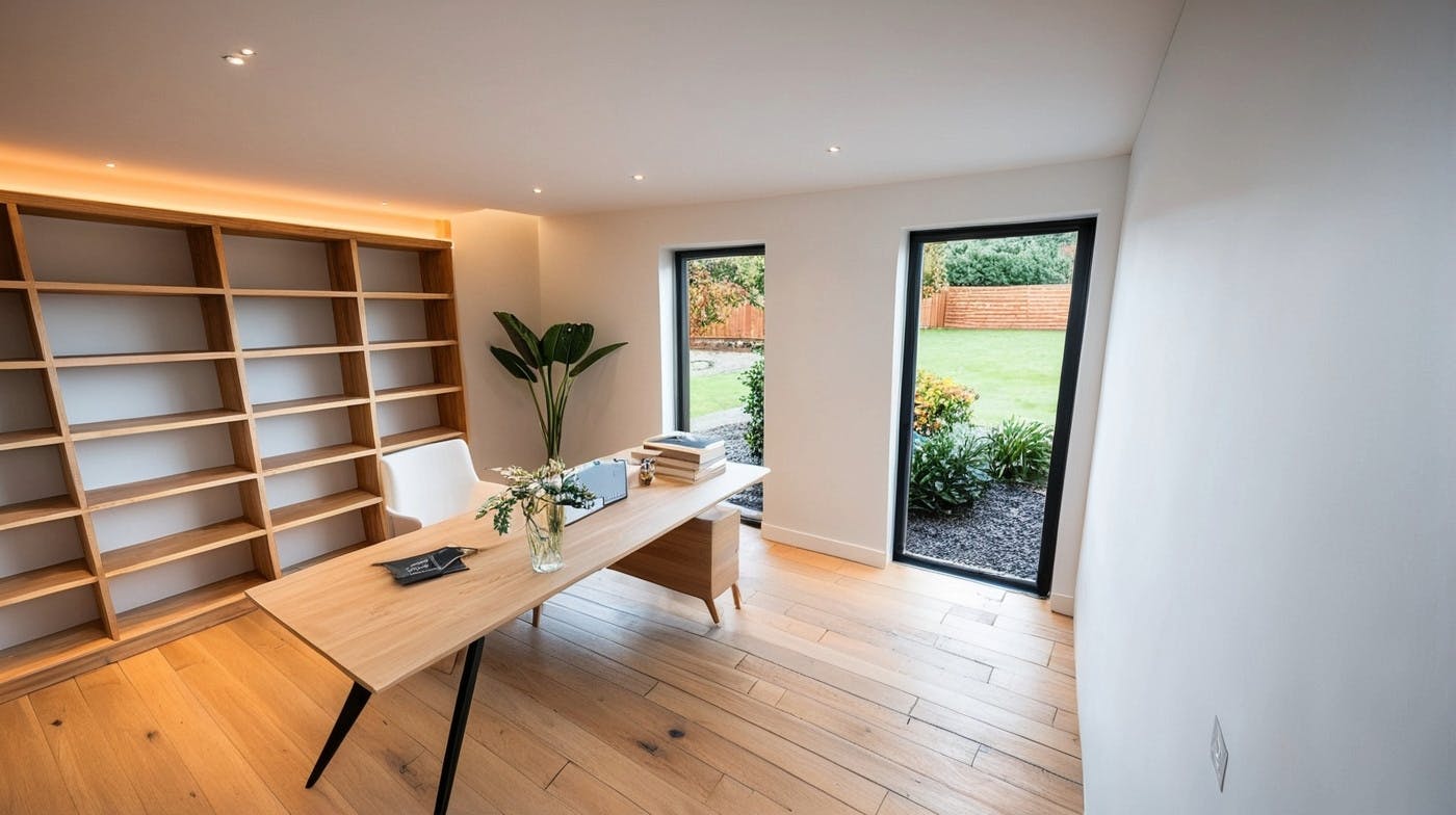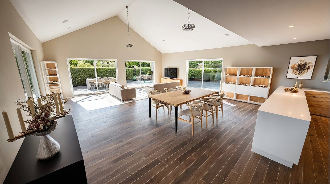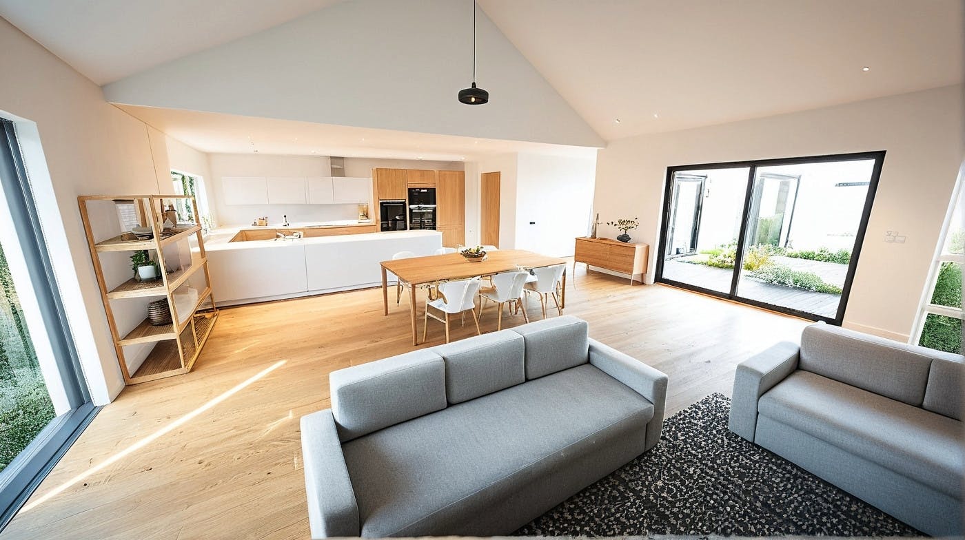 Le séjour s’ouvre sur une terrasse en lisière d’un espace arboré, offrant un cadre verdoyant et apaisant au quotidien. Le prolongement des façades dessine naturellement une terrasse ombragée, pensée pour prolonger les usages en extérieur tout au long de la journée.